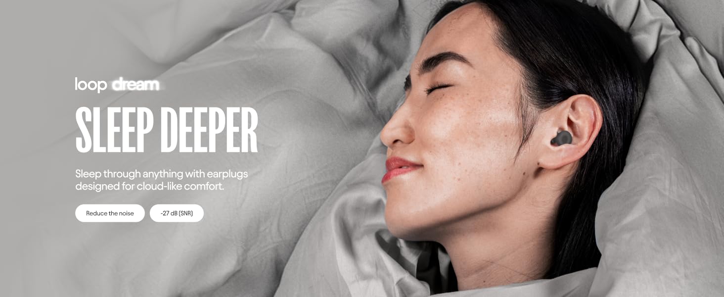Loop Dream is designed fornoise reduction during sleep, travel, or quiet relaxation. It blocks disruptive sounds (e.g., snoring, traffic, airport noise) while preserving awareness of important cues (e.g., alarms, a baby’s cry) for safe, restful downtime.